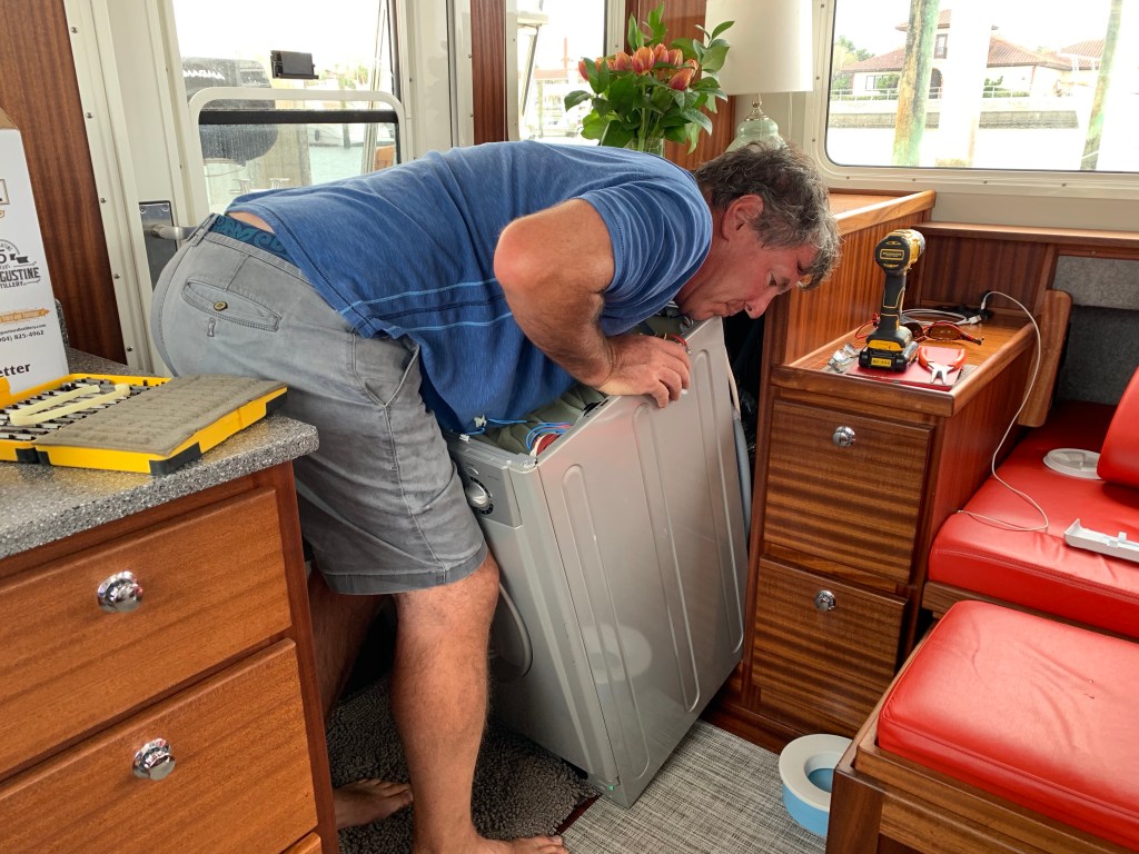 The first effort, after a few months of use when we discovered our clothes weren’t getting dry, took several hours. Bruce now has it down to about 45 minutes. We enjoy clean, dry laundry on-demand, almost anywhere-anytime. Such a joy. We try to run one small load almost every day, probably four to five days each week. I still do a large load of “boat laundry” when we have easy access to a decent laundromat (like in St. Augustine), but if need be, we can do everything on the boat.
